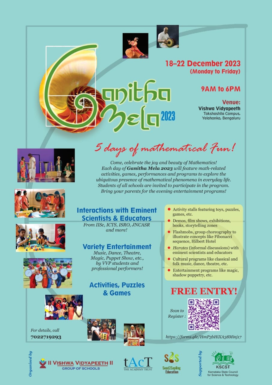 This year, to celebrate National Mathematics Day, Vishwa Vidyapeeth, the Academy Trust, Seed2Sapling Education and Karnataka State Council for Science and Technology are organising a week-long "Ganitha Mela" (Mathematics Fair) at Vishwa Vidyapeeth School (Takshashila campus), Yelahanka, for school students and the general public from 18-22 December 2023 (Monday to Friday). Each day of the event will feature math-related activities and cultural programs for all age groups, to explore the ubiquitous presence of mathematical phenomena in everyday life.The attached brochure will give details of all the events and brief about the esteemed dignitaries conducting different events through all the 5-days.